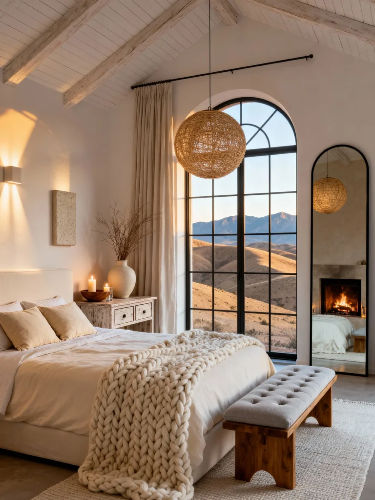 The textures are what make this space work. You have that massive, chunky knit throw—the kind that looks like it was made with giant knitting needles—and a woven globe pendant light that casts beautiful shadows at night. The color palette is strictly tonal: creams, sands, and light oaks. Even the fireplace reflected in the mirror adds a layer of “visual warmth” that doesn’t require extra furniture. It’s a minimalist’s version of cozy, focusing on quality materials and the natural light of the “golden hour.”
