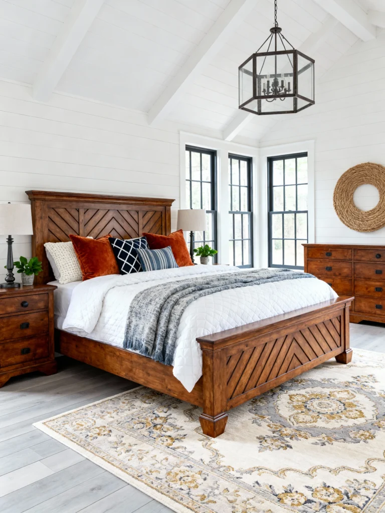 This room is for the person who loves a bit of “Modern Farmhouse” with a masculine edge. The wood bed frame is stunning, specifically that herringbone pattern on the headboard and footboard. It’s a great way to add visual interest without needing a lot of extra “stuff” on the walls. The white shiplap walls and bright white vaulted ceiling keep the room feeling massive, even with the dark furniture.