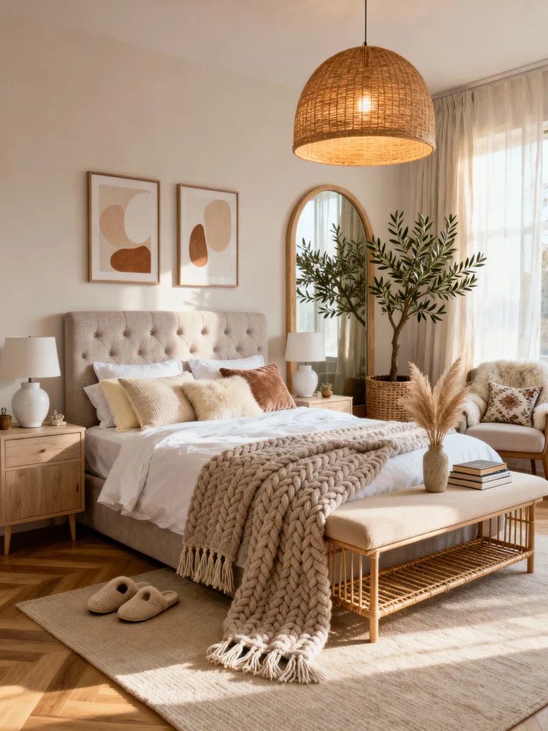 If you’re a fan of “Boho-Rustic,” this is your dream room. This space is a masterclass in layering. You’ve got a tufted headboard, a chunky knit blanket, a woven bench, and a pampas grass arrangement. It’s a lot of different textures, but because they are all in the same “oatmeal and biscuit” color family, it doesn’t feel cluttered. It feels rich.