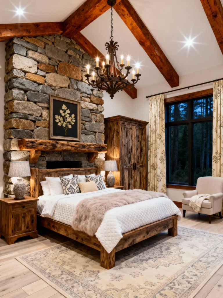 Despite the heavy stone and wood, the room feels bright. The light-colored wood floors and the white quilted bedding keep it from feeling like a dark cave. The floral curtains add a bit of “Grandmillennial” charm, softening the ruggedness of the stone. Imagine lying in that bed with a fire crackling and looking out that big window at a snowy forest—it’s the definition of “hygge.” It’s a room built for winter nights and total relaxation.