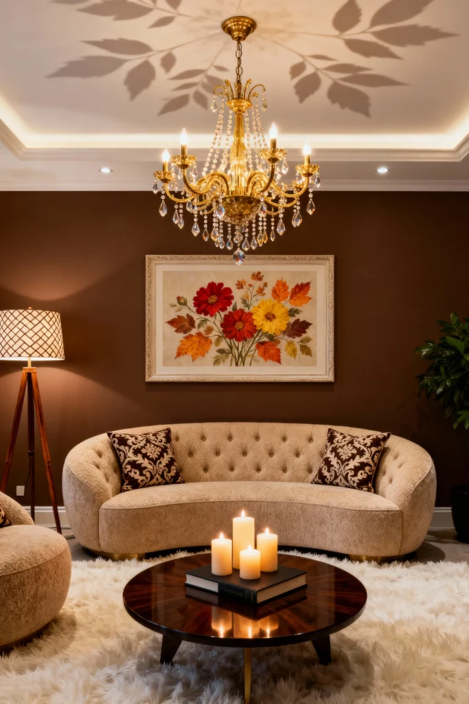But let’s talk about the real star: the lighting. That crystal chandelier is gorgeous, but look at the ceiling! The way the light throws leaf-patterned shadows upward is a total pro move. It adds texture to the ceiling without needing any paint. Between the chandelier, the floor lamp, and the candles on the coffee table, the room has “layered lighting,” which is the secret to making a space feel high-end. If you want this look, go for warm-toned woods, a plush white shag rug to contrast the dark walls, and don’t be afraid of a bold, floral statement painting to tie all those reds and oranges together.