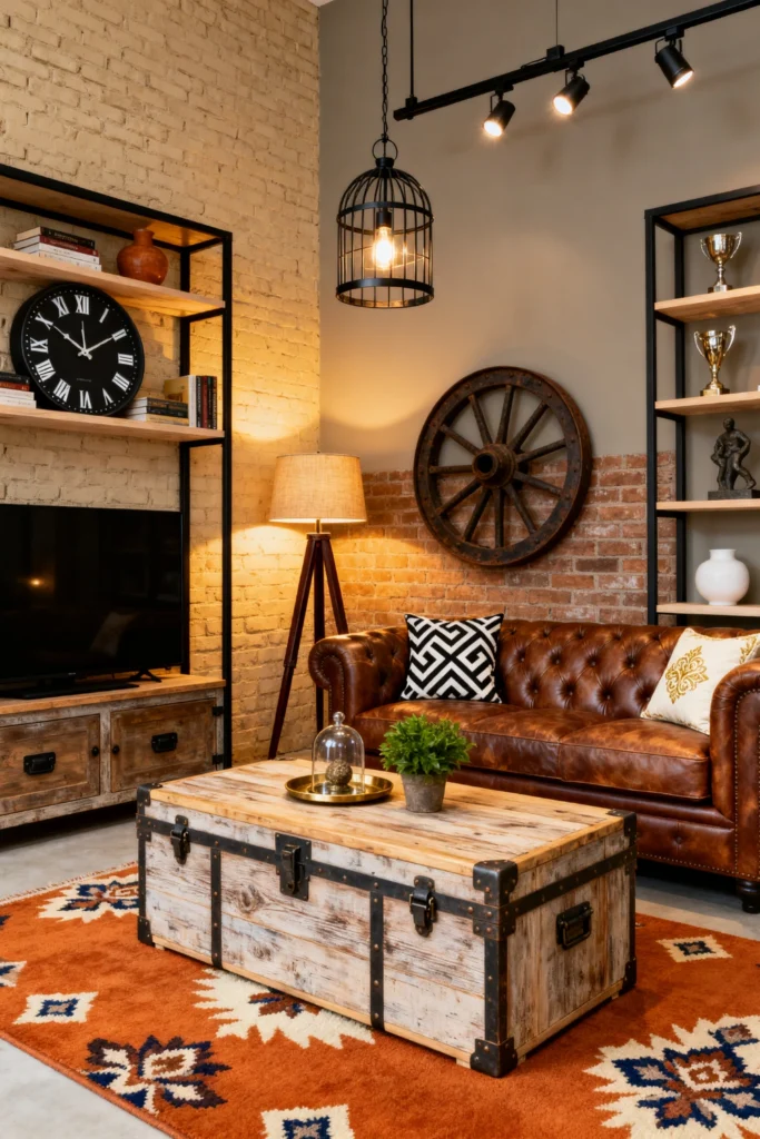 Last but not least, we have the Industrial Loft look. This is all about raw materials: exposed brick, black metal, and reclaimed wood. The coffee table is literally a vintage shipping crate, which is such a cool, functional conversation piece.