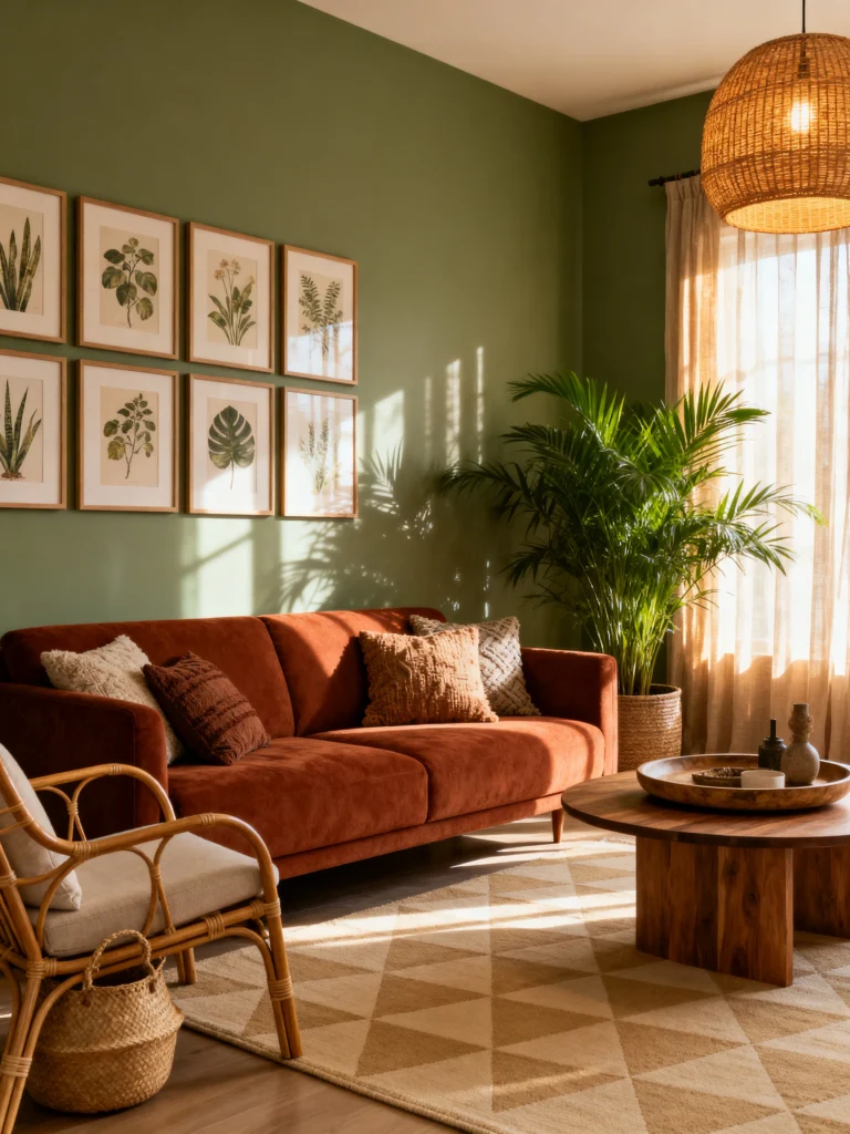 Now, let’s talk about that sofa. That burnt orange/terracotta velvet? It is the perfect dance partner for the green walls. They’re opposite on the color wheel, so they pop without shouting at each other. It looks incredibly plush—the kind of couch you actually want to take a nap on, not just look at. And those botanical prints above it! It’s such a clever way to tie the “nature” theme together without it being too “on the nose.”