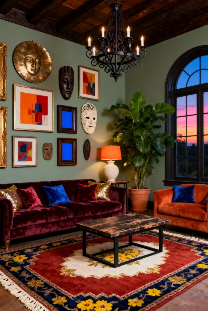 And can we talk about that window? The arched frame looking out at the sunset is basically a living painting. Pairing that view with a heavy, wrought-iron chandelier and a rustic, weathered coffee table creates this “Old World meets Modern Art” vibe. It’s a masterclass in maximalism—filling a space with things you love until it feels like a physical manifestation of your soul.