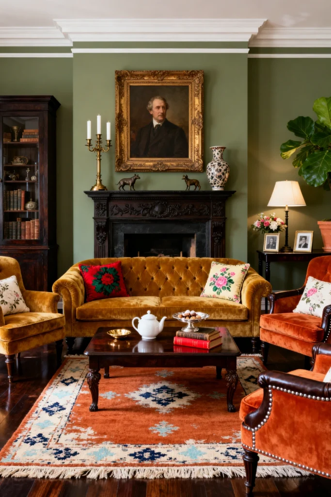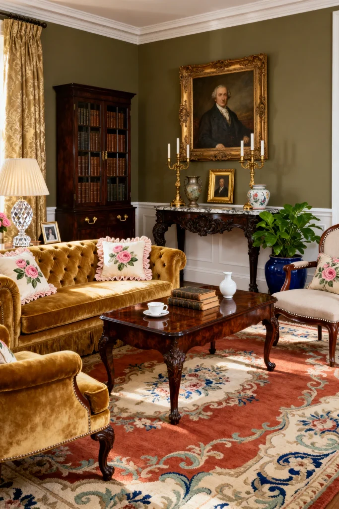 The ochre velvet sofa is a total showstopper. Velvet just has this way of catching the light that makes everything look more expensive. And the floral pillows? They add just the right amount of “cottage-core” sweetness to balance out the serious oil portraits on the wall. It’s all about the layers here—the ornate marble-top console table, the brass candlesticks, and that stunning Persian-style rug.