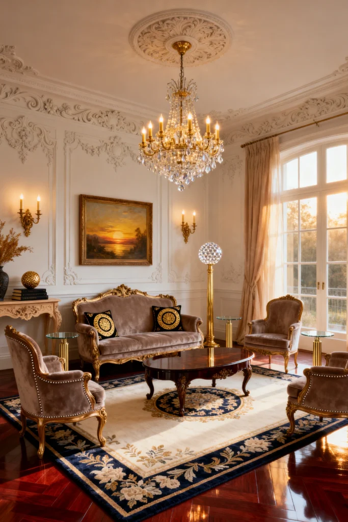 The centerpiece is obviously that massive crystal chandelier. It’s spectacular. But notice how the furniture is actually quite delicate. The curved, champagne-colored sofa and the matching armchairs have these beautiful gold-leaf frames that feel light and airy despite being so ornate. It prevents the room from feeling “heavy.”
