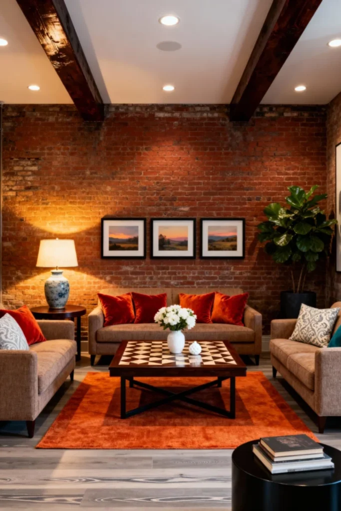 Switching gears entirely! This is such a cool, urban loft vibe. If you’ve got exposed brick walls, you’ve already won half the interior design battle. Brick brings so much natural warmth and texture to a room. I love how the dark wood ceiling beams mirror the floor, sandwiching the room in these rich, organic tones.