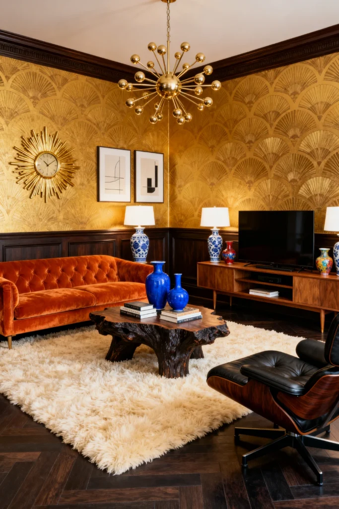 The shaggy white rug is another great choice. It softens up all the hard lines of the wood and the geometric wallpaper. It adds a bit of 70s flair that makes the room feel more “fun” and less “museum.” This is a room for someone who loves to entertain and wants their house to be the “cool” one on the block.
