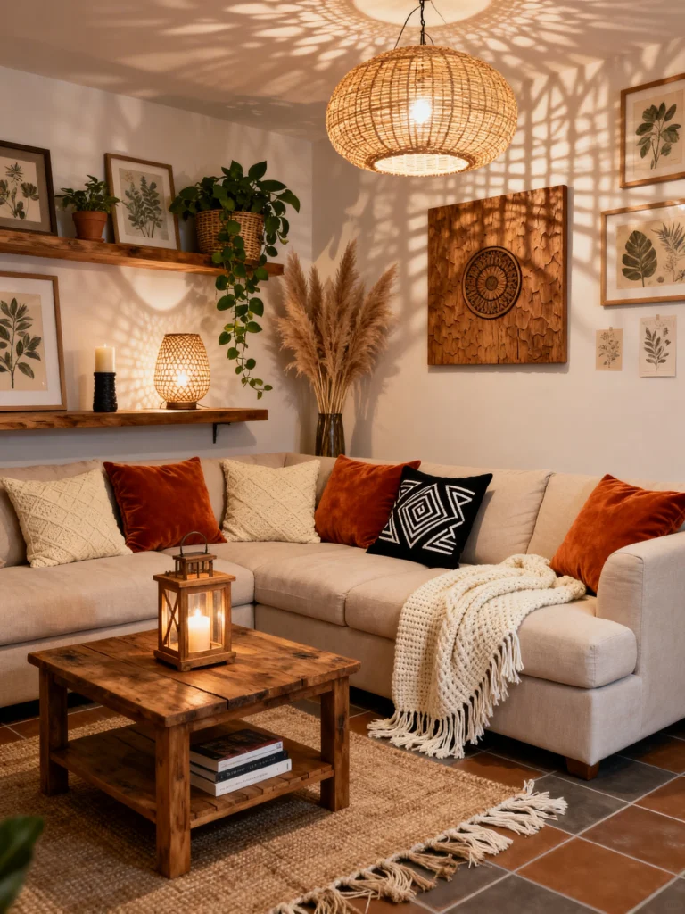 Notice the gallery wall? It’s super organized. Instead of random frames, they’ve used a black picture ledge and consistent black frames with abstract, geometric art. This is a great tip if you’re a perfectionist; it’s way easier to level a shelf than it is to hang ten individual pictures perfectly! The rug adds a bit of “Global Chic” with its geometric pattern, and the macramé wall hanging adds a touch of softness to the “hard” lines of the furniture. This room is perfect for someone who wants their home to look curated, artistic, and energetic.