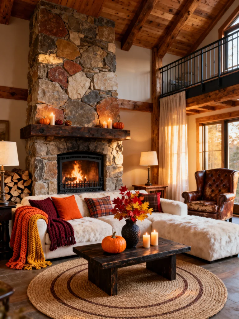 It’s clearly themed for autumn with the pumpkins and the maple leaves, but the “bones” of the room are great year-round. The high ceilings with exposed wood rafters give it so much breathing room. It feels massive, yet that fireplace makes it feel intimate at the same time.