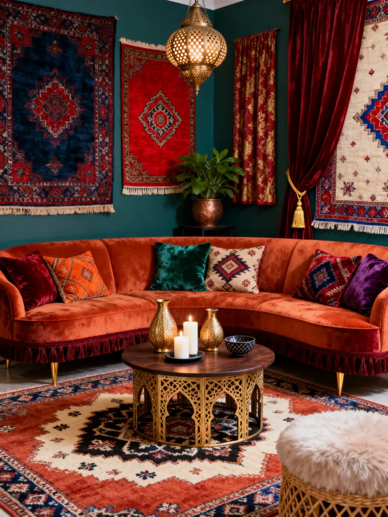Last but certainly not least, we have this jewel-toned dream. This is “Bohemian Luxury” at its finest. The deep teal walls are the perfect backdrop for all those rich reds and golds. Using rugs as wall art is such an underrated move—it adds instant texture and a sense of history to the walls.