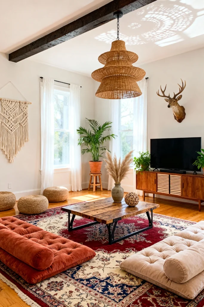 What makes this work is the low-profile seating. Instead of a massive, bulky couch, we see these floor cushions (or “majt”) that keep the sightlines open. It makes the room feel much larger than it probably is. The deer head on the wall adds a bit of “cabin in the woods” vibe, but the bright white curtains keep it from feeling too heavy or masculine. If you have a room with great natural light, this is the way to go. Focus on natural materials like rattan, jute, and linen.