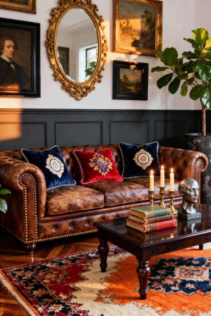 The decor here is very “collector.” You’ve got oil paintings in ornate gold frames, a bust on the coffee table, and old hardcover books. It feels smart and sophisticated. But look at the pillows—those deep blue and red velvets with gold embroidery. They provide a “jewel tone” contrast to the brown leather. If you want this look, head to your local antique shop. Look for gold-framed mirrors and anything that looks like it has a story to tell.