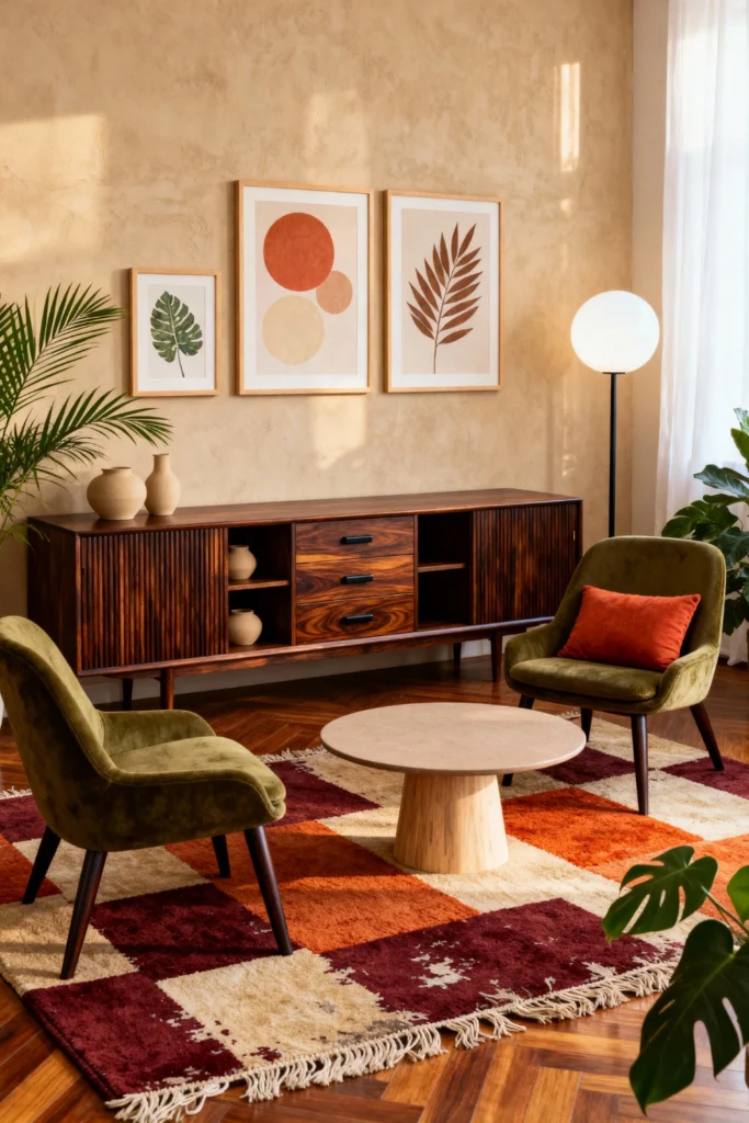 That long, dark wood sideboard is a mid-century classic. It provides tons of storage while acting as a stage for those beautiful, minimalist vases. The chairs are “statement chairs”—moss green velvet with thin wooden legs. And can we talk about that checkered rug? Checkered patterns are huge right now, and using them in these muted, autumnal tones makes the trend feel timeless rather than trendy. This room is perfect for someone who loves a clean, uncluttered space but still wants it to feel warm and inviting.