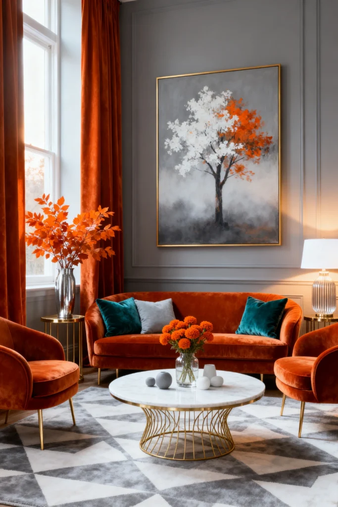 This room is pure Hollywood Regency glam. It’s polished, it’s symmetrical, and it’s very “dressed up.” The grey paneled walls provide a cool, neutral backdrop for that incredible burnt orange velvet sofa. Velvet is the ultimate fabric for adding “depth” to a color because of the way it catches the light.