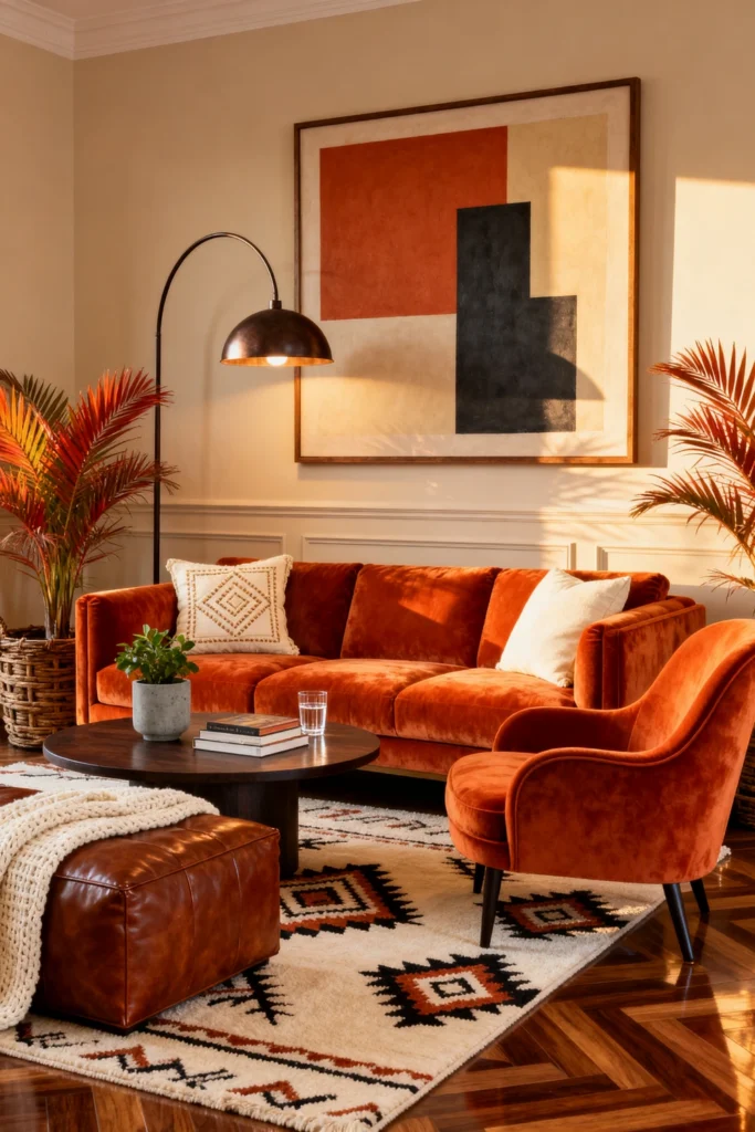 If the first room was a warm hug, this one is a shot of espresso. It’s Modern Mid-Century with a serious edge. That burnt orange velvet sectional is the absolute focal point. Orange and charcoal grey are a match made in design heaven—the grey keeps the room sophisticated, while the orange keeps it from feeling cold or boring.