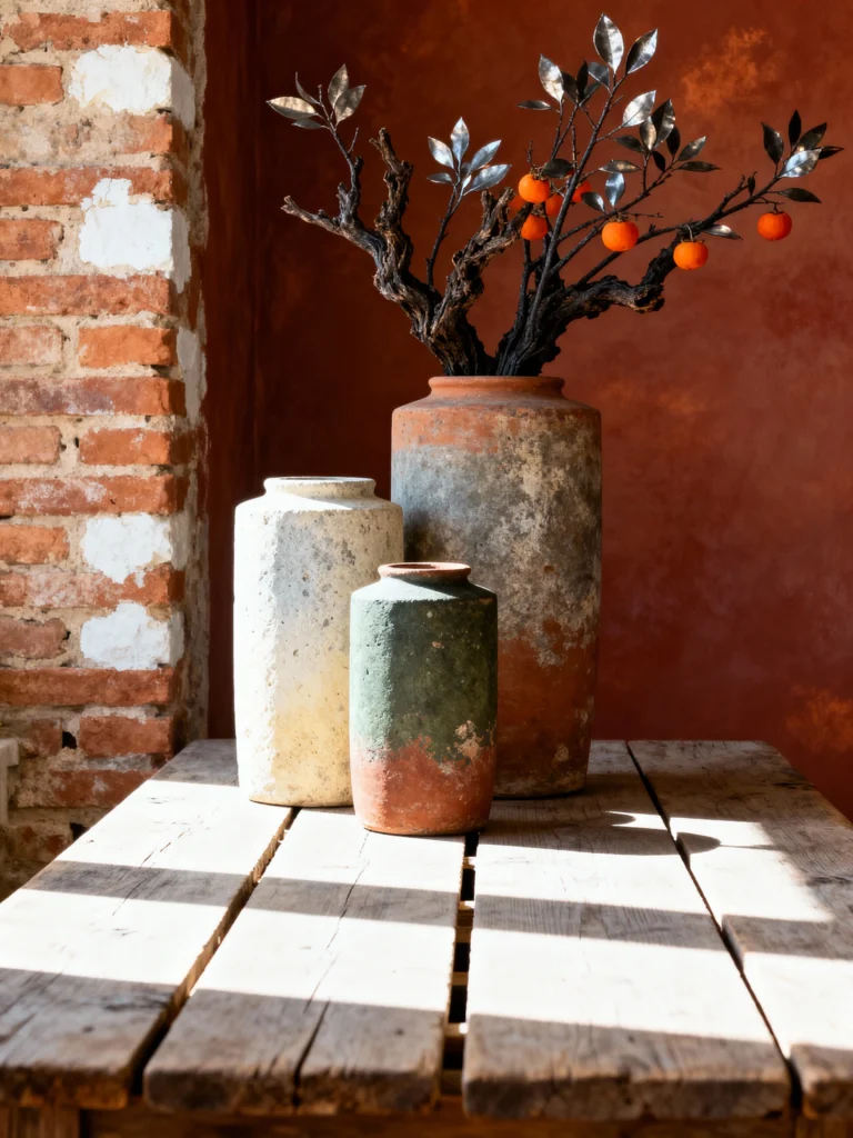 The tallest one has these beautiful patches of grey and ochre, looking almost like moss growing on a stone. Then you’ve got the creamy white one providing some light, and that shorter, moss-green pot that anchors the whole group. What really sells the scene for me is that gnarled, dark wood branch with the orange persimmons. The contrast between the rough, matte ceramic and the pops of bright fruit against that terracotta-colored wall is just chef’s kiss.