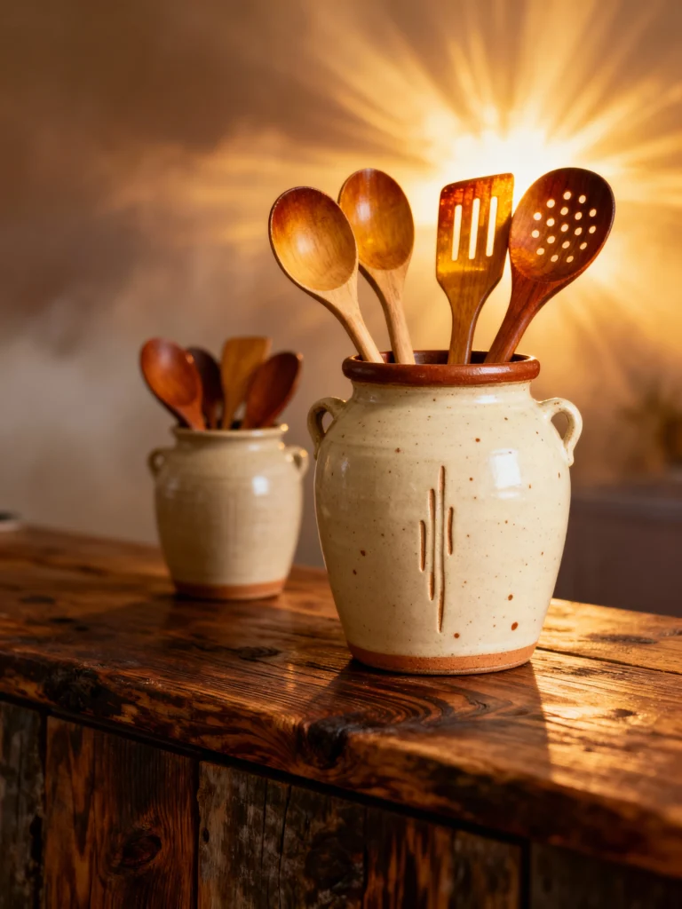 But what really makes this image special is the lighting. That warm, golden light streaming in (or glowing from behind) makes the glaze look so inviting. It highlights the speckles in the clay and the warm tones of the wooden spoons.