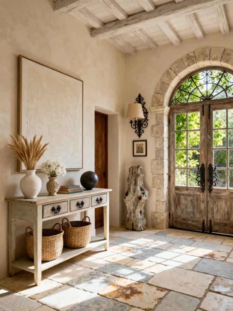 You know that feeling when you walk into a house and instantly feel your heart rate drop? That’s exactly what’s happening here. This entryway is the ultimate masterclass in “Old World meets modern peace.” First off, can we talk about that light? It’s pouring in through those gorgeous arched wooden doors like it’s been invited for tea. The stone archway surrounding the door gives it so much weight and history—it feels like this house has stories to tell.