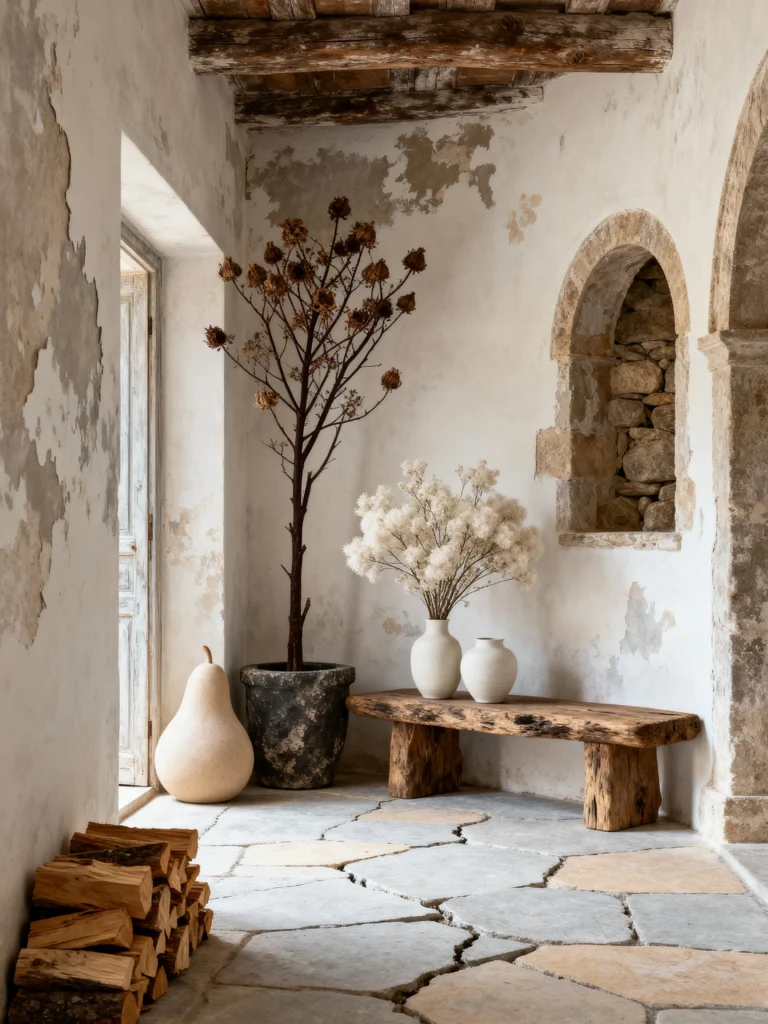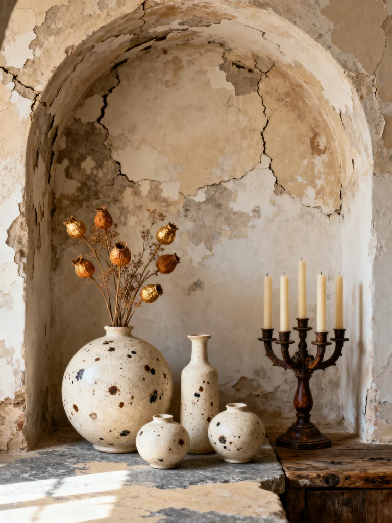 Okay, I’m obsessed with this little nook. Most people see a cracked, peeling wall and think “I need to call a painter,” but here, the decay is the actual art. It’s that Wabi-Sabi philosophy—finding beauty in things that are aging. That arched niche creates such a dramatic backdrop for a simple collection of ceramics. Those vases with the dark, splattered “beauty marks” look so tactile; you just want to run your hand over them.