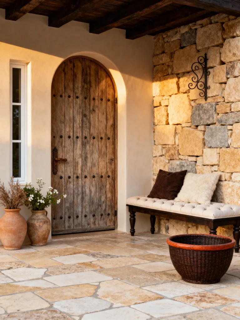 Is there anything more inviting than a heavy, arched wooden door? This looks like the entrance to a villa in the hills of Tuscany or Greece. The stonework here is the real star—look at those varying shades of sand, grey, and gold. It’s rugged, but the tufted bench with the plush pillows softens everything up. It’s the perfect spot to sit and pull off your boots after a walk.