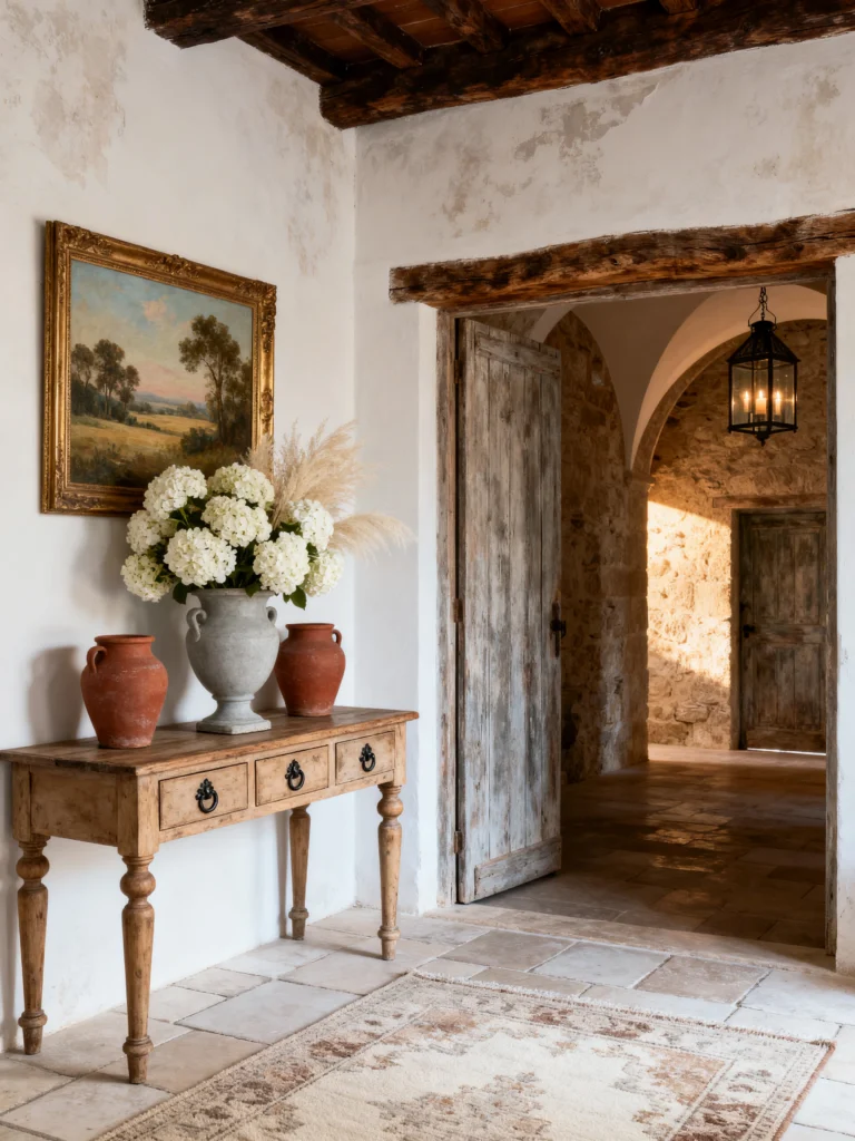 This view makes the house feel like a maze of beautiful surprises. You’re standing in one room, looking through a heavy timber-framed doorway into a vaulted stone hallway. It’s all about the layers! The console table here is a bit more refined with those turned legs, and it’s styled with such a classic touch: a massive vase of white hydrangeas flanked by two simple terracotta jars.