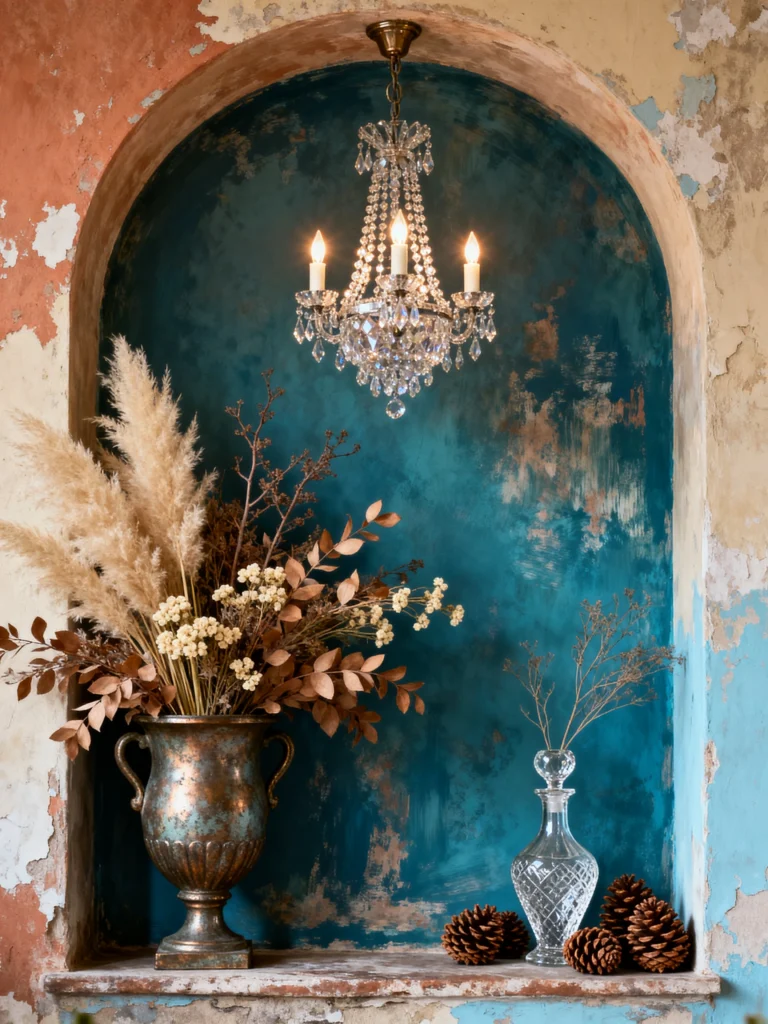 Wait, can we just pause for this blue? After seeing so many neutrals, this deep, teal-washed niche is a total “wow” moment. It’s painted in a way that looks like watercolor, with the old plaster peeking through. Putting a crystal chandelier inside a rough, weathered alcove is the kind of design “risk” that pays off big time. It’s high-low styling at its best.