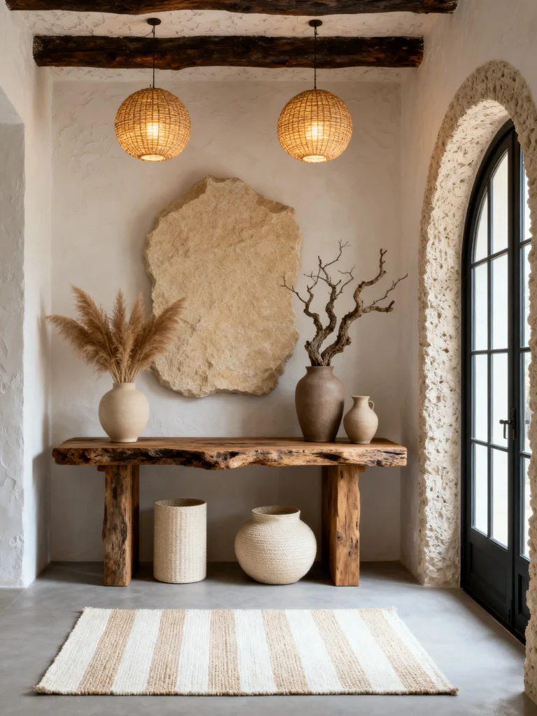 The furniture stays low and horizontal—a long, live-edge wooden bench that holds just a few large vessels and a twisted branch. The striped rug adds a bit of rhythm to the floor, leading your eye toward that arched black-framed door. It’s a very curated look, but because the materials are all so natural, it doesn’t feel forced.