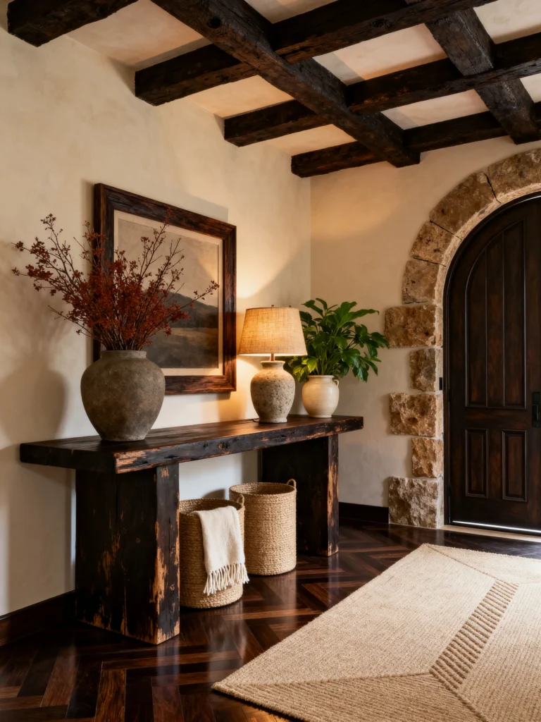 This space takes a turn toward the darker, moodier side of rustic design. Look at those ceiling beams—they are dark, heavy, and rugged, matching the massive “chunky” console table below. The herringbone wood floors add a level of craftsmanship that makes the room feel expensive, while the stone archway keeps it grounded.