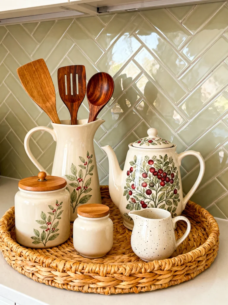 What I love most here is the mix of materials. You’ve got the creamy, glazed ceramic of the teapot and pitchers, but then you’ve got those warm wooden lids on the canisters. It creates such a cozy, tactile experience. And can we talk about that herringbone tile in the background? The soft sage green of the tiles perfectly complements the greenery painted on the pots.