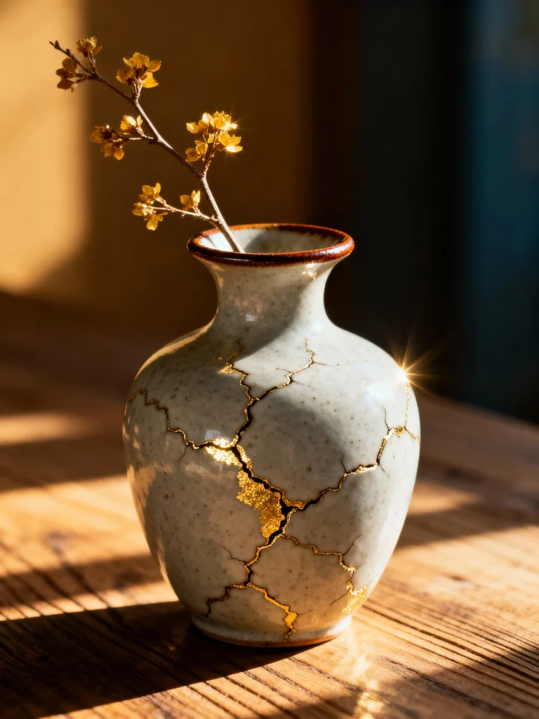 If Image 2 was the “moody, dramatic” version of Kintsugi, this one is its bright, airy cousin. This little vase is just lovely. It’s a pale, speckled ceramic—almost like a bird’s egg—and the way the sunlight hits those gold-filled cracks is just magical.
