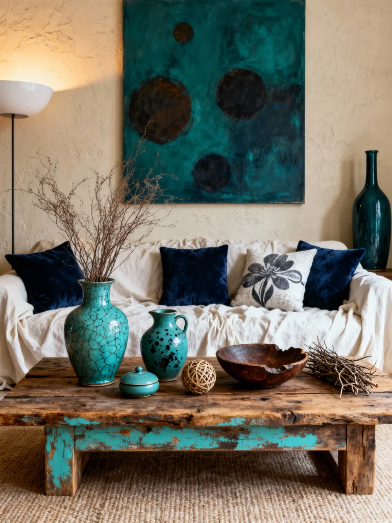 The styling here is what really pulls me in. You’ve got the deep navy velvet pillows and that abstract teal painting on the wall, which makes the bright turquoise of the pottery really pop. But then, to keep it from feeling too “cold,” they’ve added a rustic wooden coffee table and a simple wooden bowl.