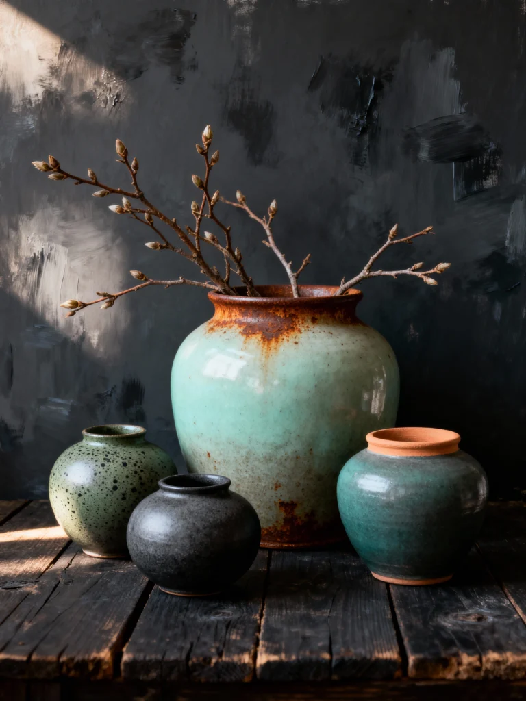 The contrast between the smooth, glossy finish of the smaller dark pots and the rough, aged texture of the big one is brilliant. It’s a study in opposites: light and dark, smooth and rough, new and old. The dark, moody background and the weathered wooden table make the colors of the ceramics feel incredibly rich.