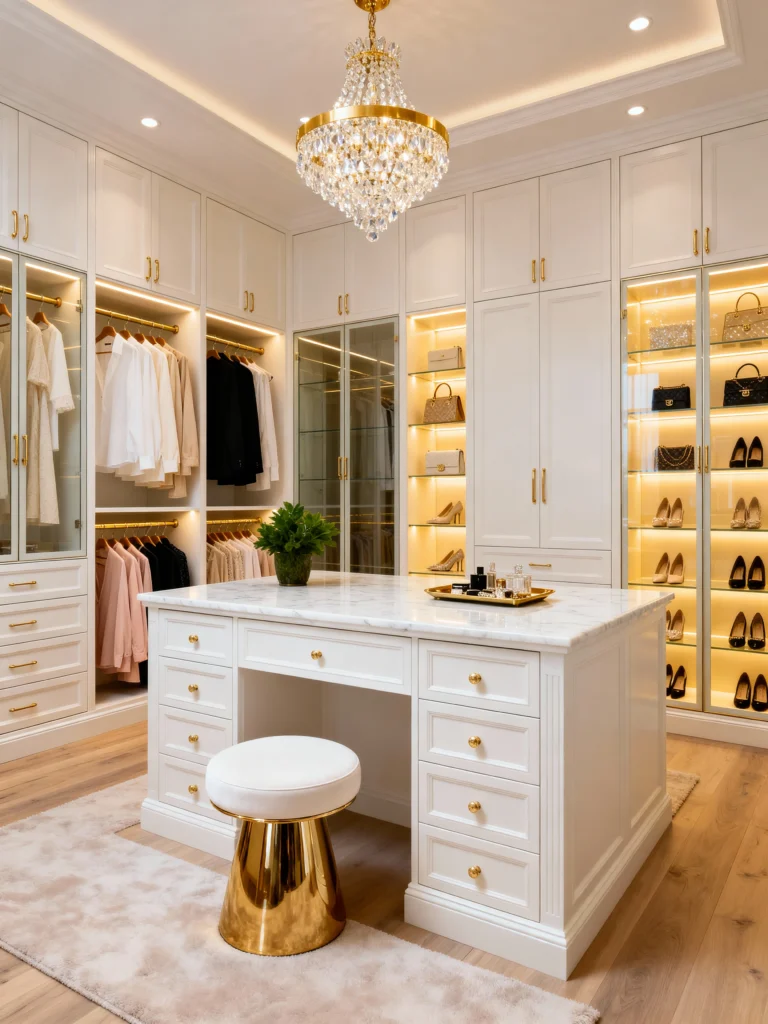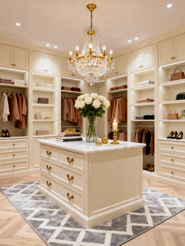 Notice how the island here isn’t just for storage; it doubles as a vanity. Having a dedicated spot to sit down, do your makeup, and look at your jewelry under a chandelier is the ultimate flex. If you have a smaller room but want it to feel huge, go for all-white cabinetry like this. It reflects the light and makes everything look crisp and clean.