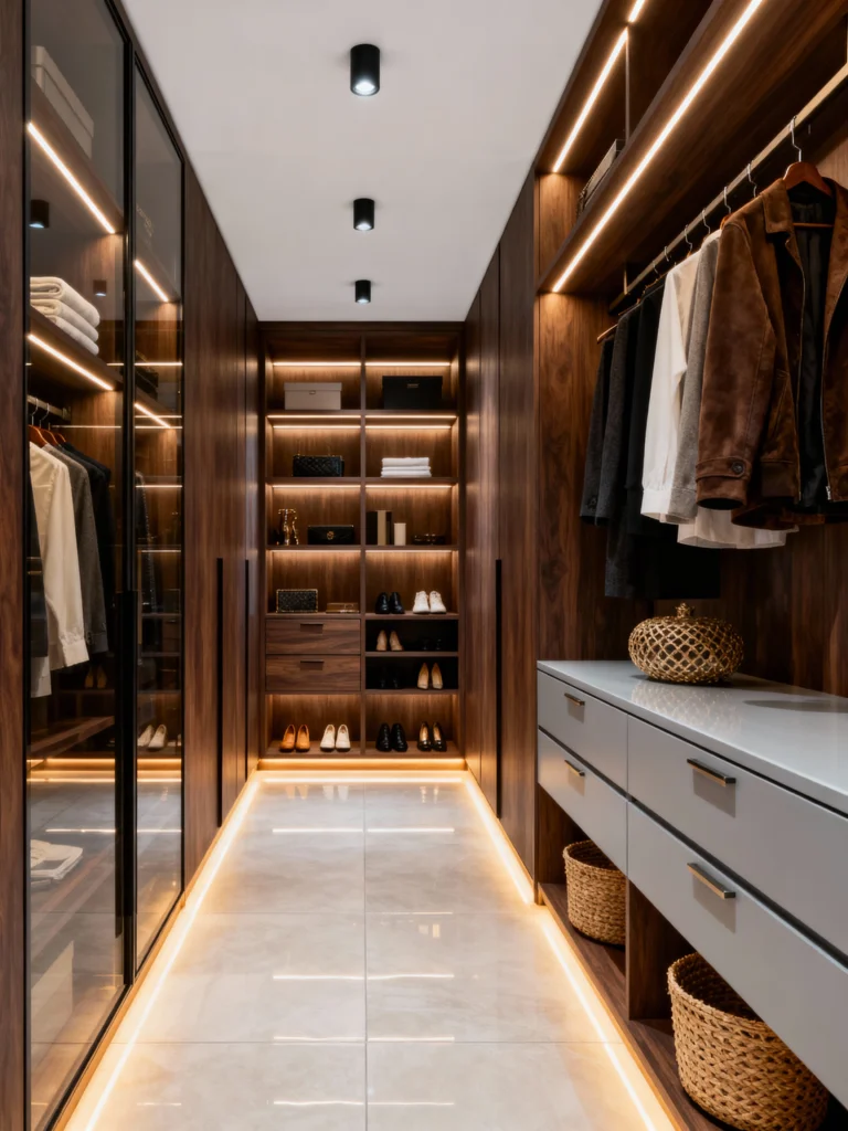 Let’s start with some serious drama. If Batman had a walk-in closet for his suits (the non-armored ones), this would be it. The dark, rich wood tones instantly make the room feel expensive and cozy at the same time. What really makes this work is the integrated LED strip lighting. Without it, this room might feel like a cave, but with those glowing shelves, every bag and pair of shoes looks like a piece of art in a museum.