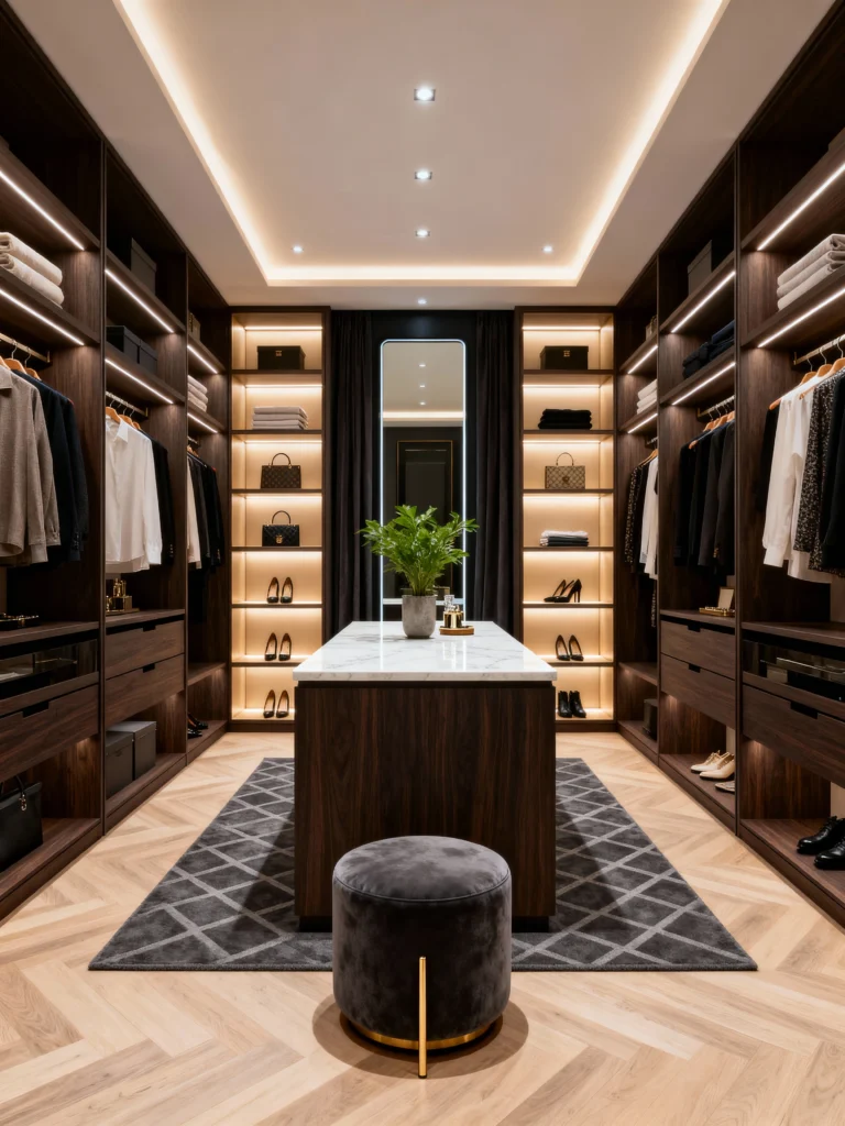 The herringbone floor adds a touch of classic craftsmanship, and that center island with the marble top? Perfection. It’s the perfect spot to lay out your accessories for the day. If you want to recreate this vibe, focus on “mood.” Keep your lighting warm, your wood finishes dark, and don’t forget a plush ottoman to sit on while you struggle with your boots.