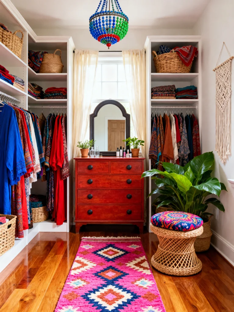The red dresser in the center is a bold choice that totally pays off. It’s not just a closet; it’s a creative studio. If you’re a fan of textiles and patterns, don’t be afraid to let your closet reflect that. Use wicker baskets for storage to keep that organic, earthy feel. This is a space where you can truly be yourself.