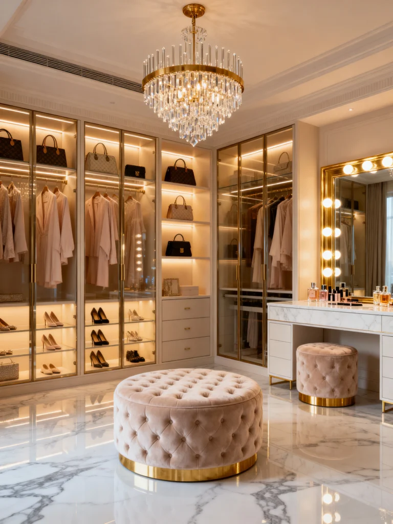The vanity area with the Hollywood-style bulb mirror is every makeup lover’s dream. It provides the perfect even lighting for getting ready. If you want this look, prioritize reflective surfaces—glass, marble, and polished gold—to bounce light around and create that “shining” effect.
