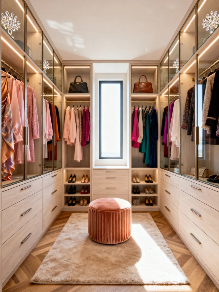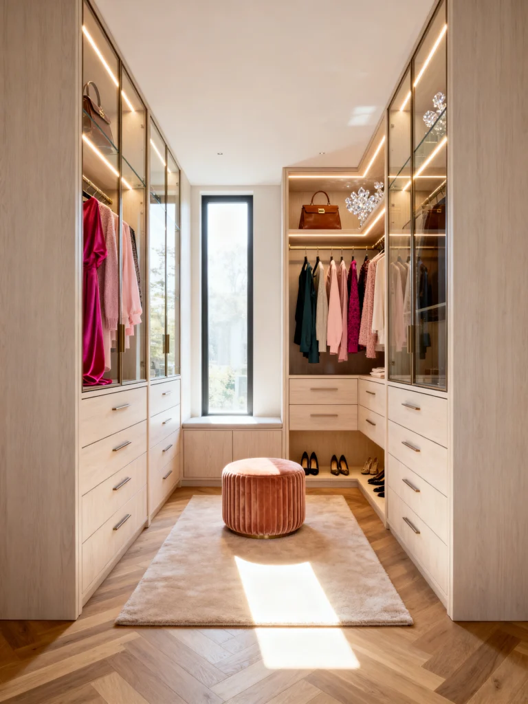 This closet is a lesson in balance. The symmetry of the shelving on either side of the window makes the space feel very organized and intentional. I love the soft pink velvet ottoman right in the center; it adds a pop of softness to the clean lines of the wood.