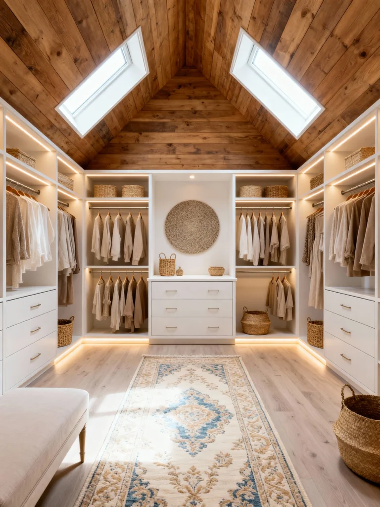 Okay, can we talk about these vaulted wooden ceilings? This is the ultimate “Cottagecore” dream. Using an attic space for a closet is such a smart move, especially when you have skylights letting in all that natural light. There’s something so grounding about the mix of natural wood and clean white shelving.