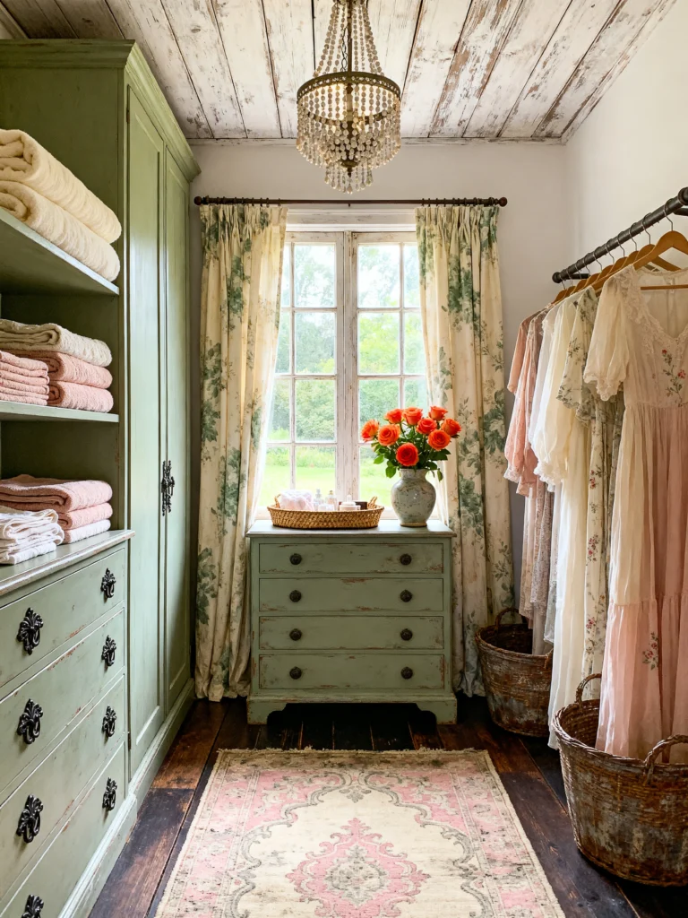 Finally, we have something completely different: the “Cottagecore” closet. This feels like it belongs in a beautiful French farmhouse. The sage green cabinets with the distressed finish give it so much character.