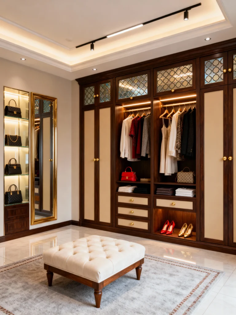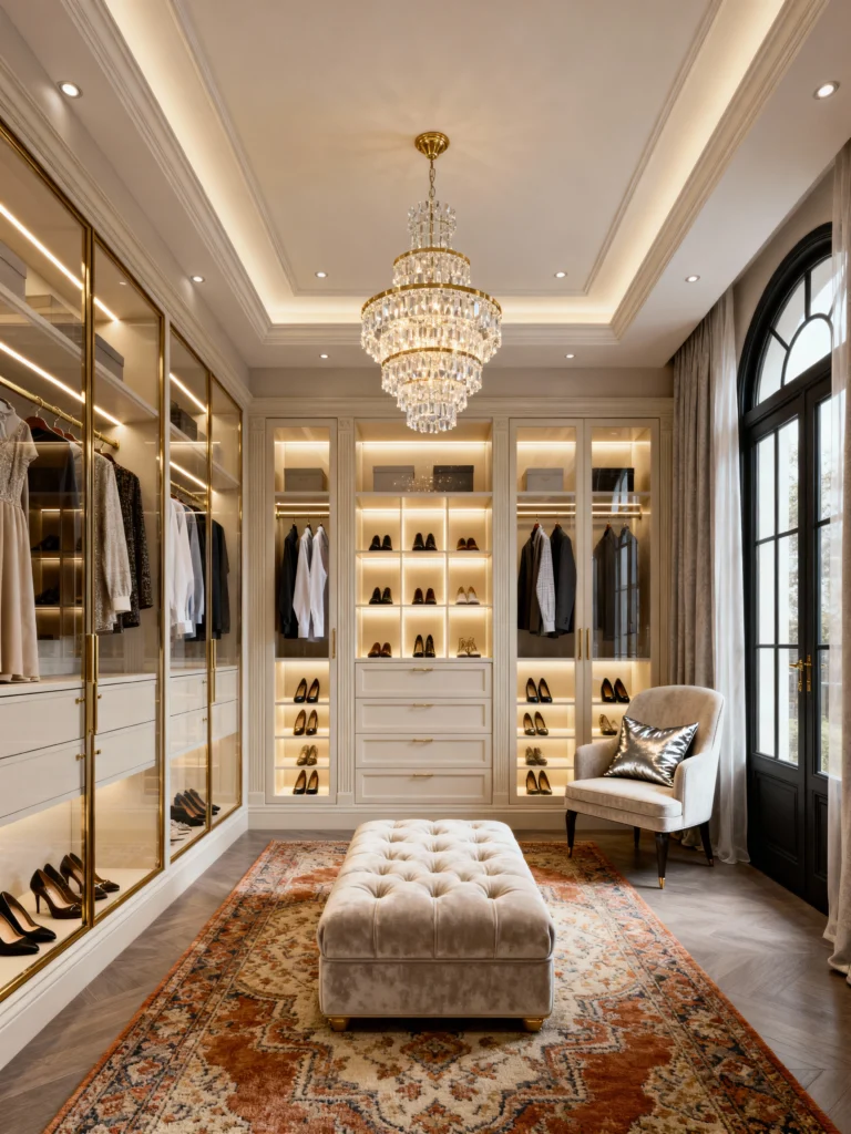 The lighting design here is layered—you have the recessed ceiling lights, the chandelier, and the internal shelf lighting. This ensures there are no dark corners. The traditional Persian-style rug adds a touch of “old world” charm to a very modern layout. It’s the kind of closet you’d find in a sprawling estate.