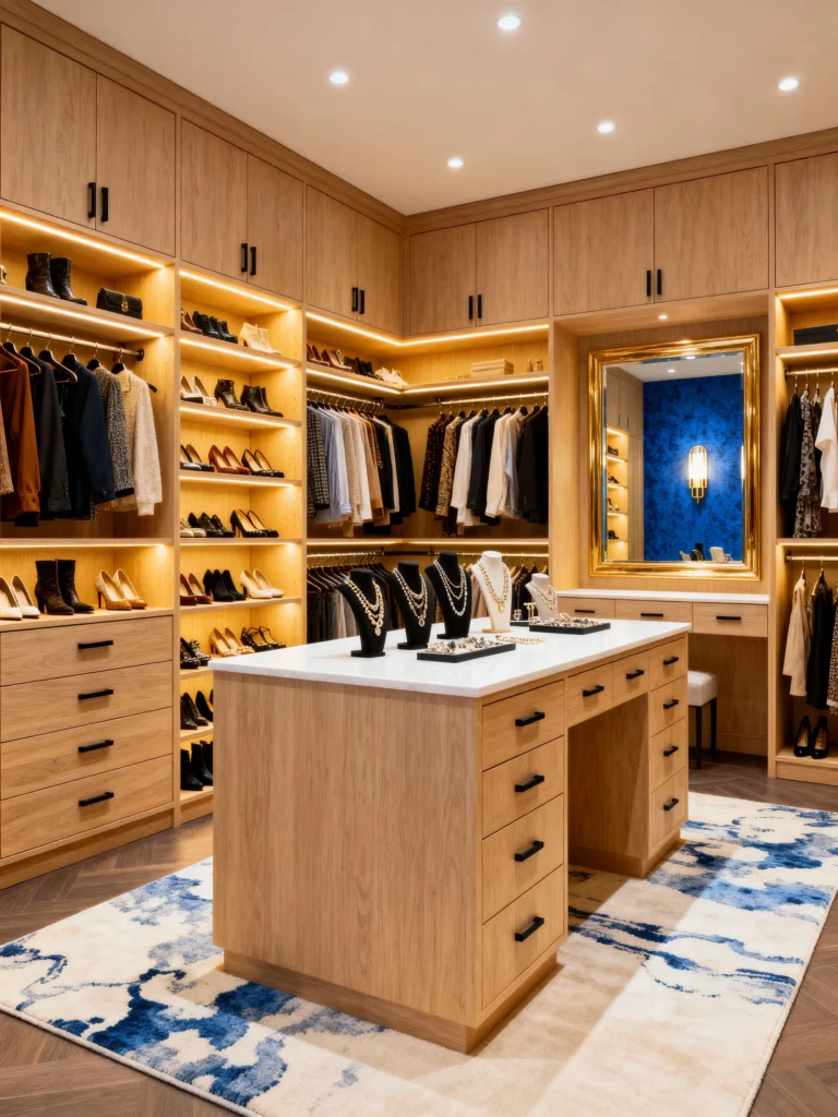 What I find most interesting here is the island. It’s not just for storage; it’s set up like a jewelry counter with velvet busts for necklaces. It turns the act of getting dressed into an experience. The blue accent wall seen in the mirror also adds a pop of personality—don’t be afraid to add a splash of color to your closet!