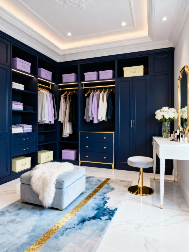 Navy blue is the new neutral, and this closet proves it. Choosing a deep, saturated color for your cabinetry is a daring move that pays off big time. It feels incredibly regal, especially when paired with those gold accents and the white marble floors.