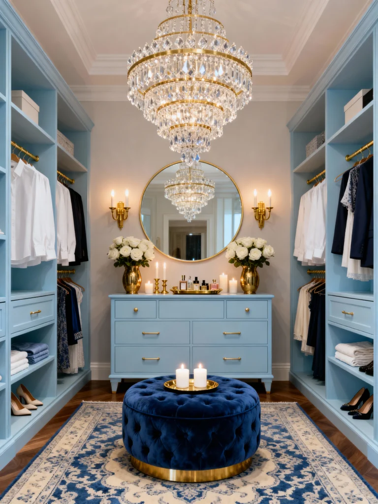 The velvet navy ottoman adds a bit of depth, and the tiered crystal chandelier brings in that classic luxury. This feels like a “princess” closet in the best way possible. It’s bright, cheerful, and would definitely make getting ready on a rainy Monday morning a lot more enjoyable.
