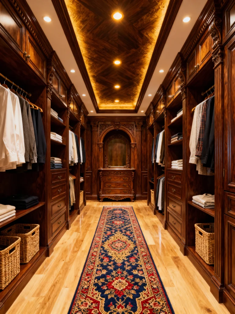 For the lover of traditional craftsmanship, this is a dream come true. This closet features rich, dark mahogany-style wood with intricate carvings and a stunning parquet ceiling. It feels like a library, but for clothes.