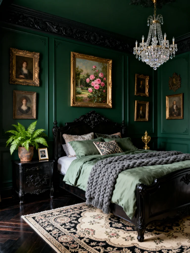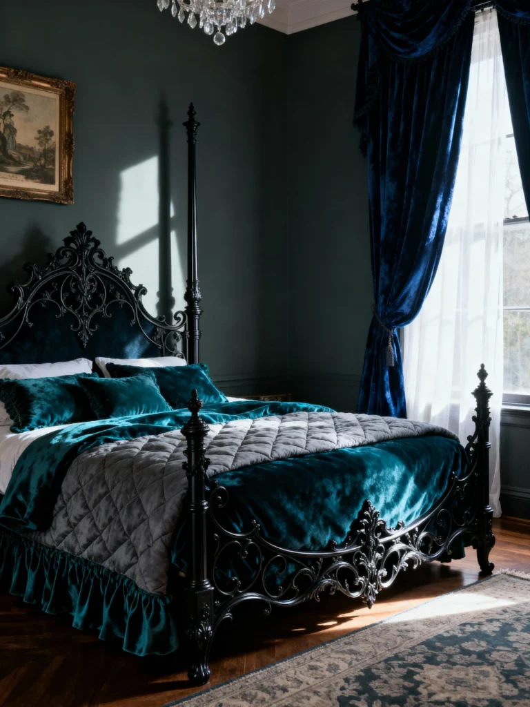 You know that feeling when you want to feel like a forest deity but also royalty? This room nails it. That deep teal/emerald on the walls is such a power move—it’s moody without feeling like a cave. The four-poster bed is the real star here; those spindly black posts reaching for the ceiling give it that perfect touch of “haunted chic.” I love how the velvet bedding catches the light; it looks so soft you’d probably never want to get out of bed. It’s elegant, a little mysterious, and totally grounded.