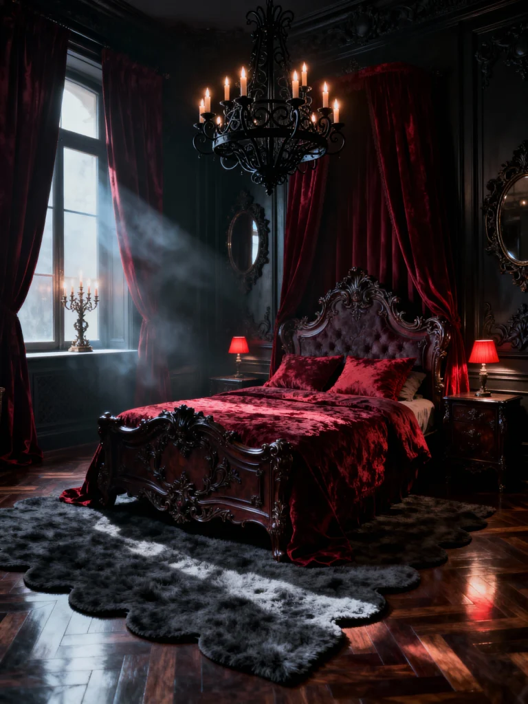 We’re ending on a high note with this lush, red-drenched sanctuary. The way the light hits the floor and the “smoke” in the air makes it look like a still from a movie. The red velvet bedding is so rich it almost looks liquid. It’s the ultimate romantic Gothic retreat—passionate, moody, and undeniably luxurious.