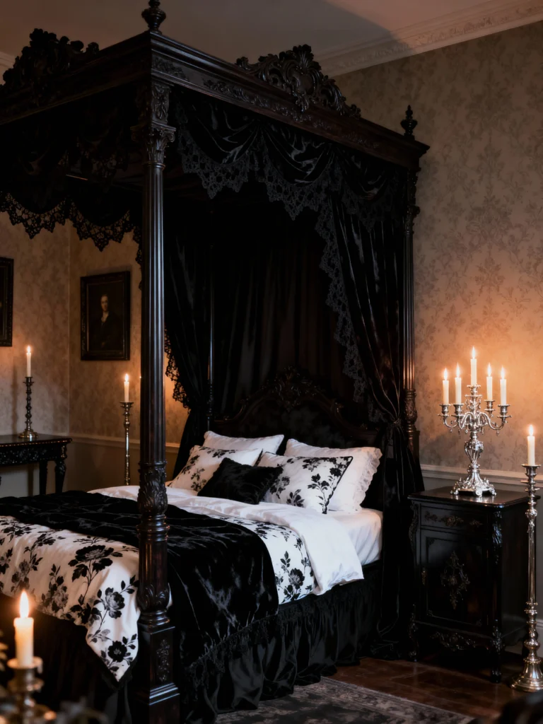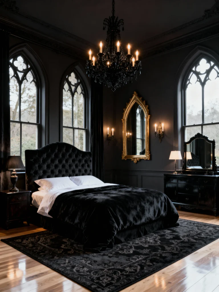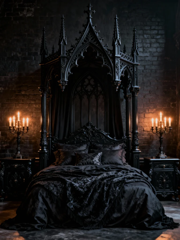 This is the “final boss” of Gothic bedrooms. It’s almost entirely monochrome black, relying on texture—brick, velvet, carved wood, and wrought iron—to create depth. The candelabras on the nightstands provide that flickering, moody light that every dark soul craves. It’s incredibly atmospheric. Sleeping here would feel like being tucked away from the rest of the world in the best way possible.