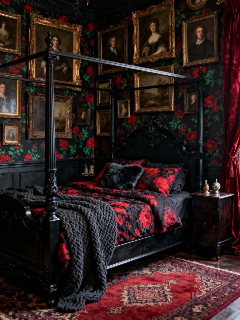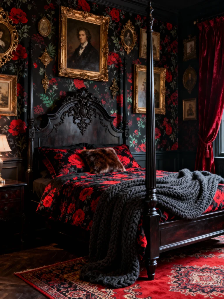 If you think floral wallpaper is just for your grandmother’s house, this room is here to prove you wrong. Those giant red roses against the black background are pure Victorian romance. This room feels a bit more “theatrical”—like something out of Phantom of the Opera. The heavy, chunky knit throw adds a great modern texture to all that vintage-inspired woodwork. It’s passionate, bold, and just a little bit dangerous.